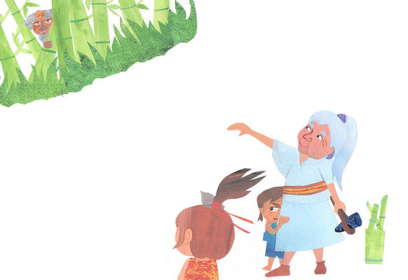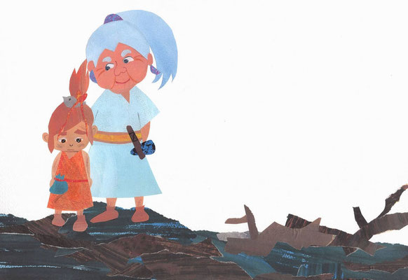 当初、ばあちゃんが若すぎたので顔をガラッと変えました。歳は重ねても逞しく優しいおばあちゃん像をイメージしました。洋服はそのままで顔だけ差し替えましたが不思議と全体のバランスが整い挑戦が成功したと思います。切り貼り絵は差し替えができるのも強みであり面白いところです。