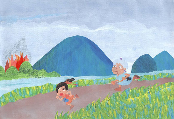 「この争いはいつまで続くのか、人間はいつから争ってきたのか」世界で今も繰り返されている紛争をテレビ越しで見るたび疑問を感じていました。対象年齢は4歳からですがシビアな部分があるので言葉選びは慎重にしました。特に苦労したのは最終場面です。希望を持って着地をしたかったのですが、どの言葉を選ぶか締め切り直前まで悩みました。編集者さんが自分の考えを尊重してくれましたので自由にのびのびと制作できました。みなさんのおかげで自分らしい作品をつくることができました。画材はおもに切り貼り絵ですがあえて汚れを出した箇所もあります。背景はアクリル絵の具を使っている場面もあります。